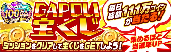 ▼毎日総額111万コインが当たる!GAPOLI「宝くじミッション」▼
