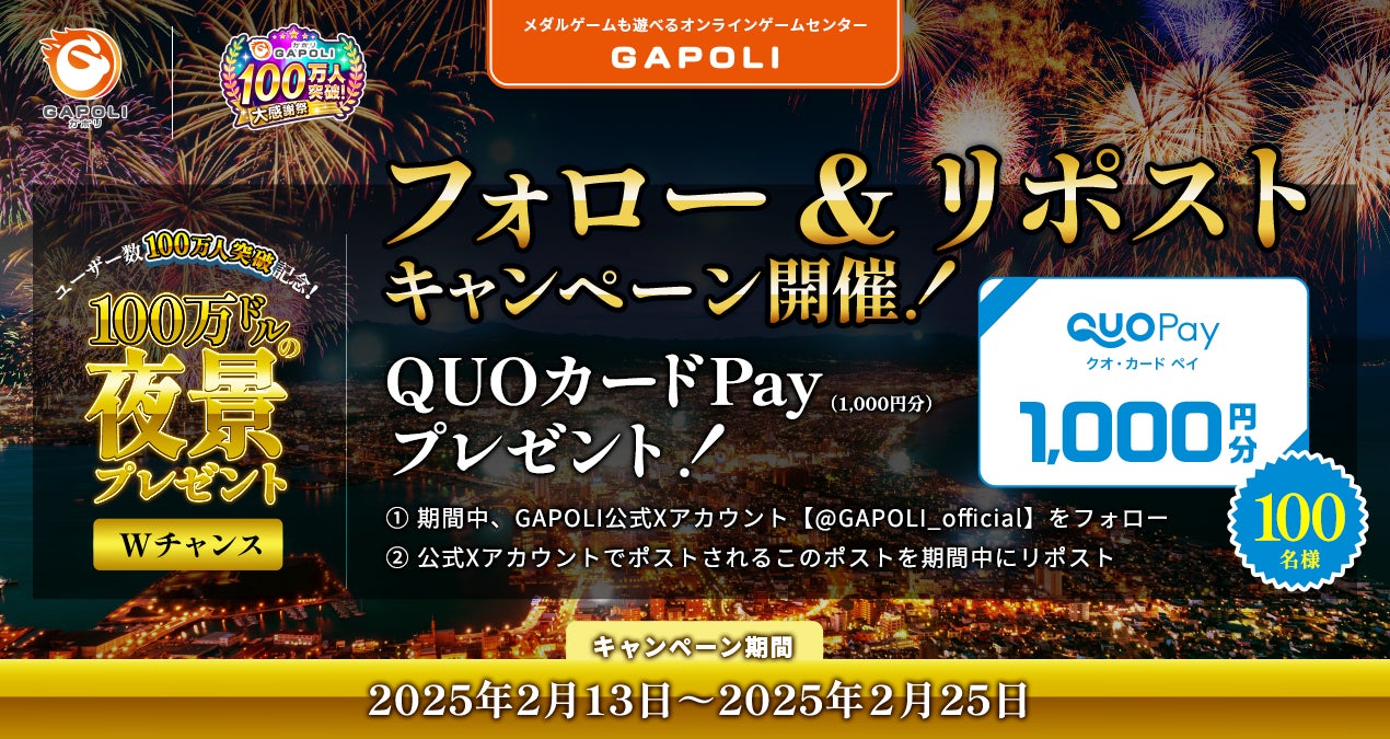 株式会社サミーネットワークスが運営するオンラインゲームセンター『GAPOLI(ガポリ)』は、このたび累計ユーザー数100万人を突破いたしました。これを記念して、2025年2月13日(木)より、「100万ドルの夜景が当たるプレゼントキャンペーン」や、魅力的な特典満載の「100万人突破大感謝祭キャンペーン」を開始いたします。
