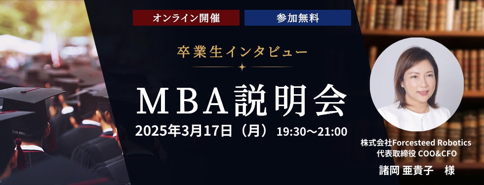 人生100年時代を迎え、キャリアにおける「マルチステージの人生」と「幅広い選択肢」が浸透しています。同時に、テクノロジーの進化により企業活動の可能性や自由度が激変し、組織の力を最大限に生かすマネジメント力やコラボレーション力、経営スキルも重要視されています。この背景から、MBAの学習ニーズが高まり、文部科学省が発表した系統別在籍者数から推定すると、日本では年間約2,500人がMBAを取得しています。この度、当社では、MBAをお考えの方あるいはスキルアップを目指す方を対象に、リアルな声を聴ける場として、本イベントを開催いたします。