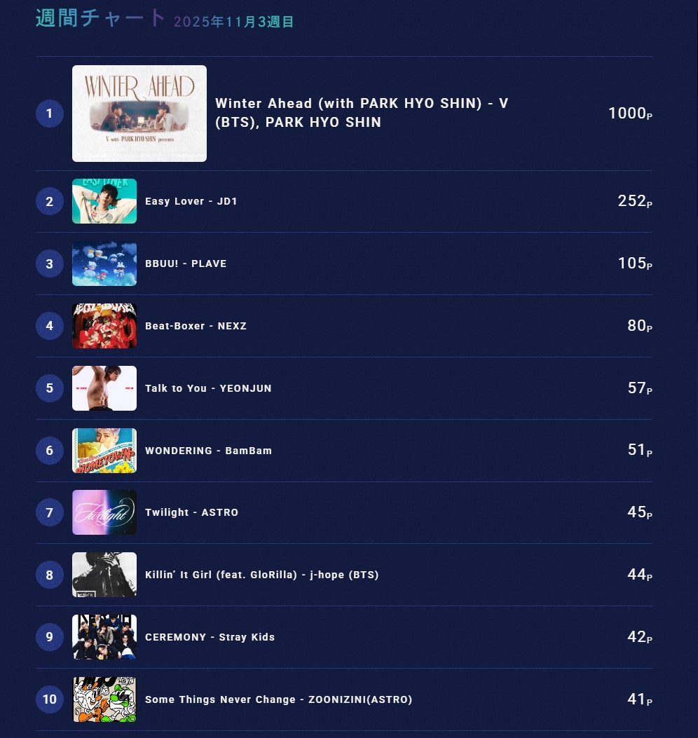 『K-STAR CHART presents POP-K TOP10 Friday』の週間チャートで1位に輝いたのは、BTSのVとPARK HYO SHINによる「Winter Ahead (with PARK HYO SHIN)」でした。番組内でも同楽曲がオンエアされました。