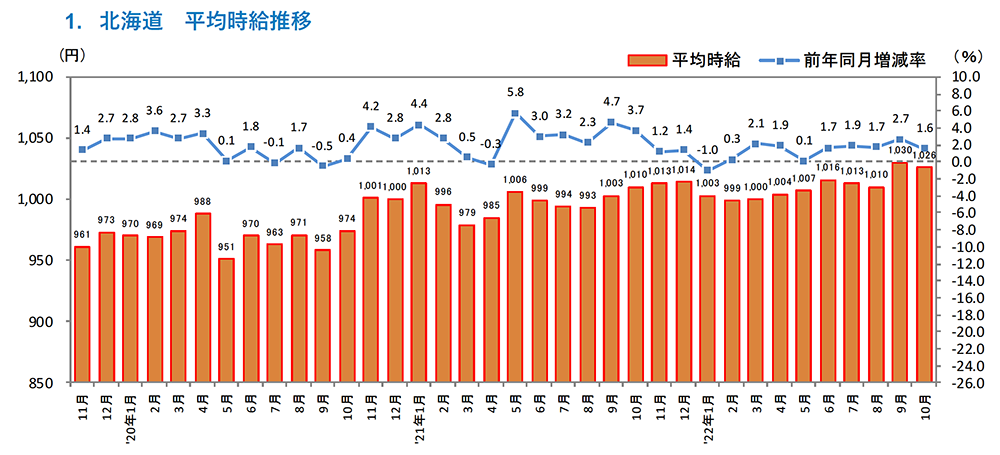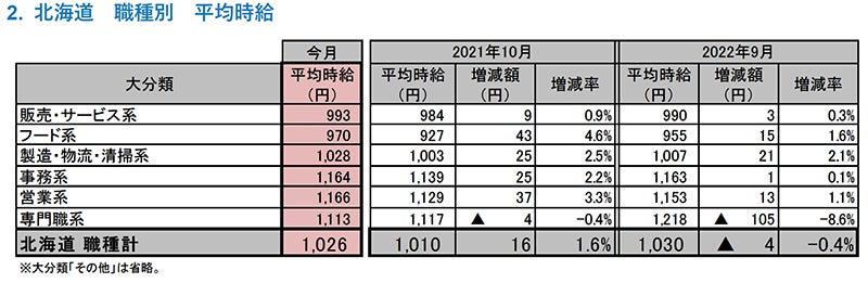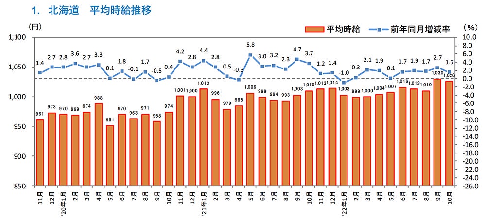 [北海道版]2022年10月度 アルバイト・パート募集時平均時給調査 北海道の10月度平均時給は前年同月より16円増加の1,026円