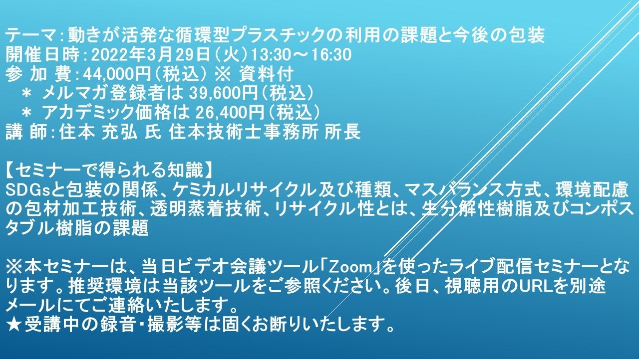 先端技術情報や市場情報を提供している(株)シーエムシー・リサーチ(千代田区神田錦町: https://cmcre.com/ )では、 各種材料・化学品などの市場動向・技術動向のセミナーや書籍発行を行っておりますが、 このたび「動きが活発な循環型プラスチックの利用の課題と今後の包装」と題するセミナーを、 講師に住本 充弘 氏 住本技術士事務所 所長)をお迎えし、2022年3月29日(火)13:30より、 ZOOMを利用したライブ配信で開催いたします。 受講料は、 一般:44,000円(税込)、 弊社メルマガ会員:39,600円(税込)、 アカデミック価格は26,400円(税込)となっております(資料付)。