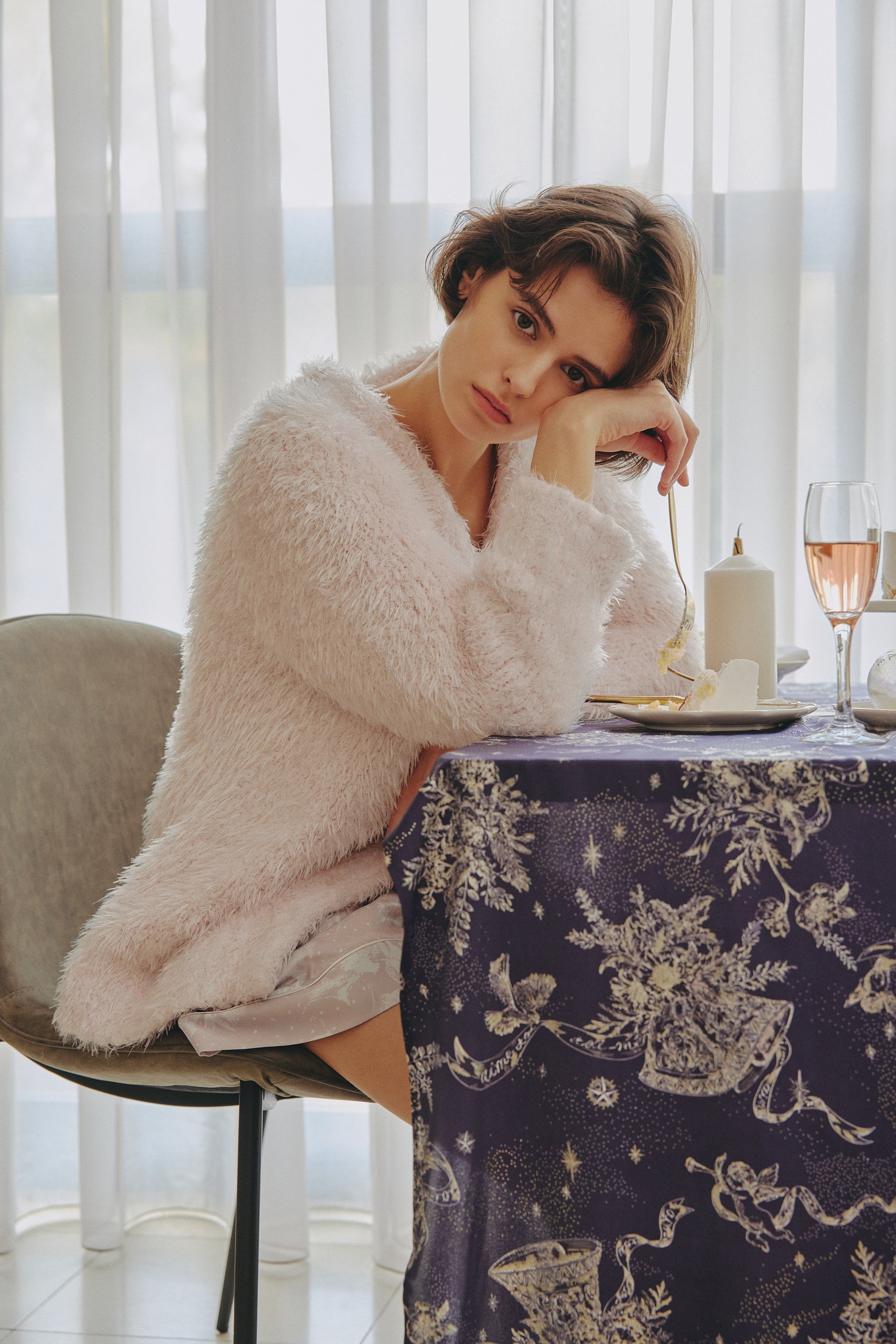 天使やオーナメントをモチーフに、シャンパンゴールドの箔プリントをあしらった華やかなトワルドジュイ柄のシリーズ。素材はサテンの光沢感と、裏起毛の温かさを兼ね備えた「Warm Satin」を使用しています。
