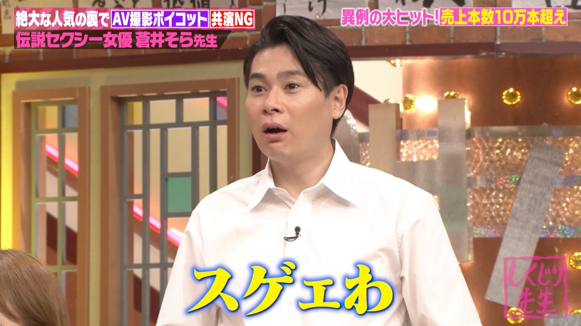 そして、デビュー2年後の2004年、セルビデオ専門メーカー『S1』からギャラ3倍のオファーを受けるも、当時の業界では“セルは格下”という風潮が強く、「セル落ちじゃん」とショックを受けた蒼井先生。しかし「セルのイメージを変えてほしい」「セルをメジャーにしたい。蒼井そらが必要」と説得され移籍を決意。結果、セルデビュー作はなんと売上本数10万本超の異例の大ヒットを記録し、スタジオでは「歴史を変えてる!」「10万本ってめっちゃすごい」と大興奮の声が飛び交いました。この成功により、バラエティ番組やドラマ出演を果たした蒼井先生は、「2005年著名人検索ランキング(女性部門)」では第2位にランクイン。セクシー女優の枠を超え、芸能界でも確固たる存在感を放ちました。