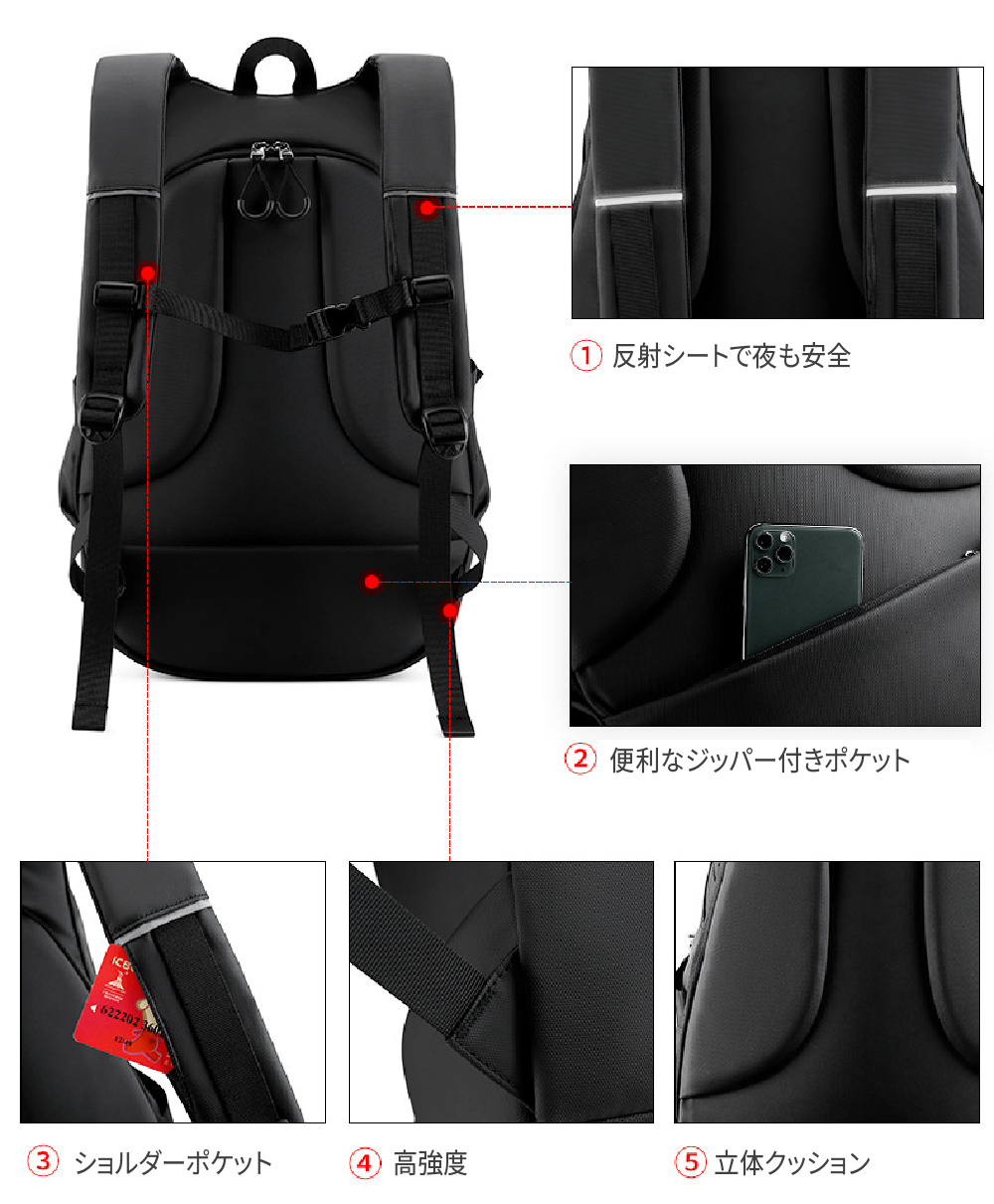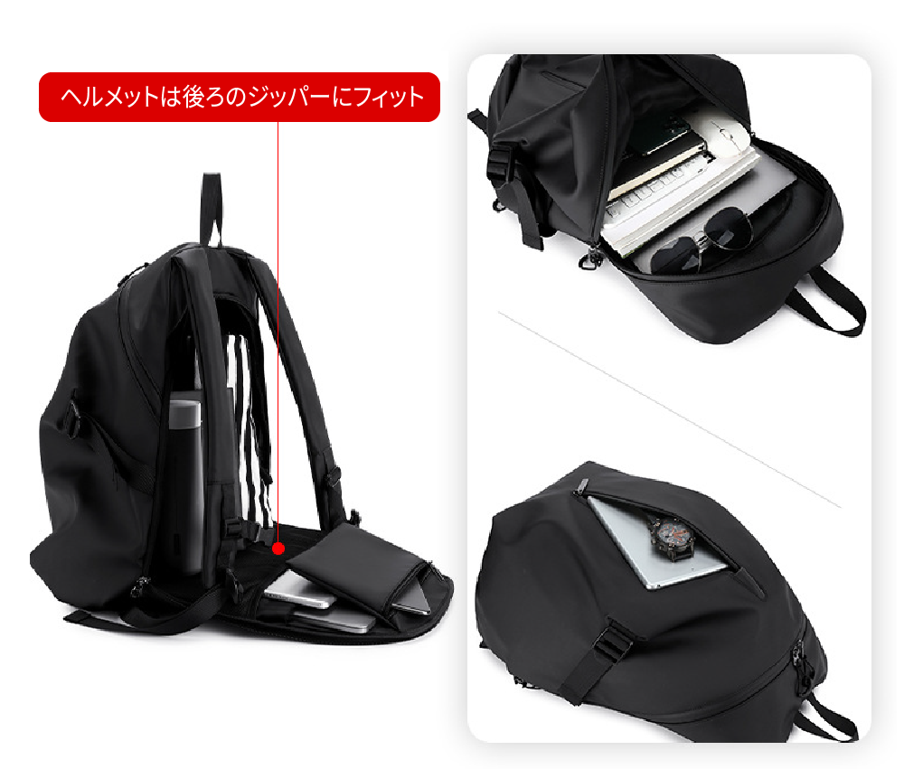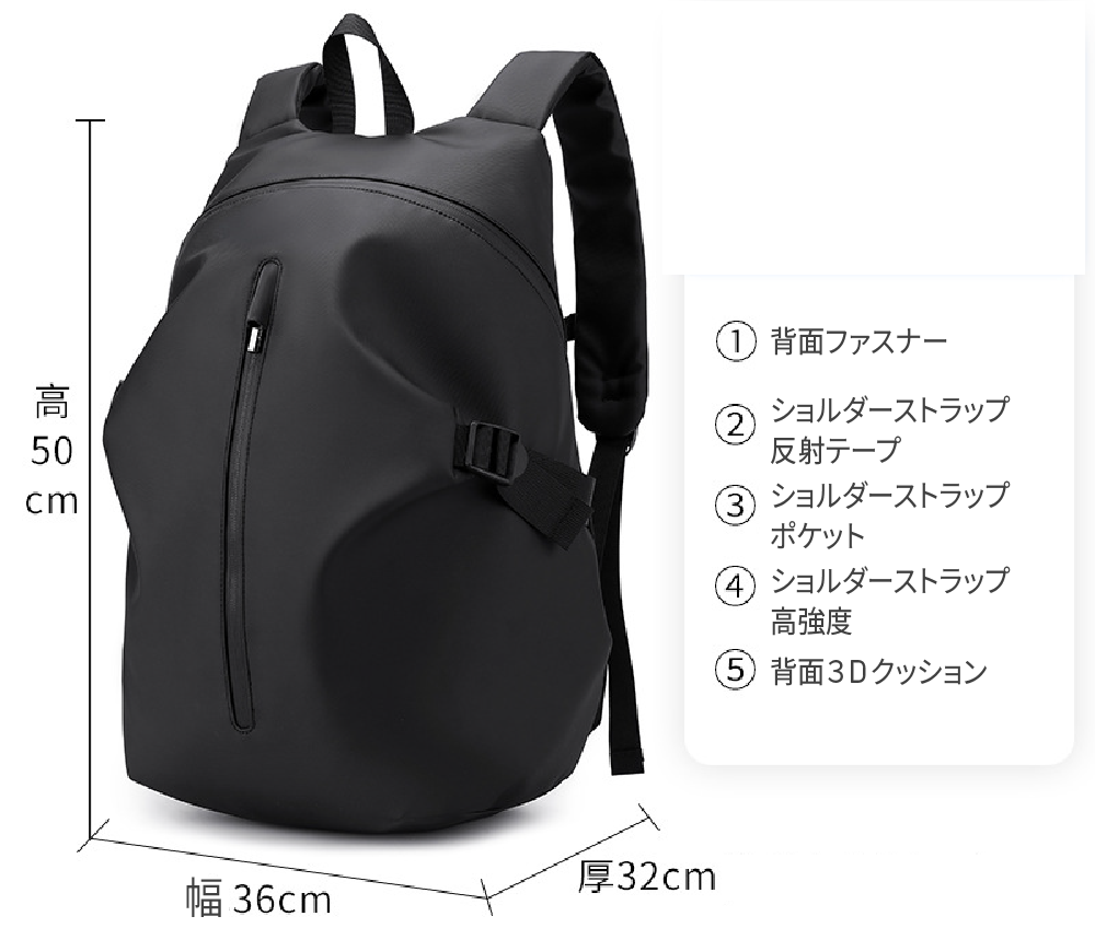 雨に強い撥水加工/夜道でも安全なリフレクター/ヘルメットが収納できる大容量