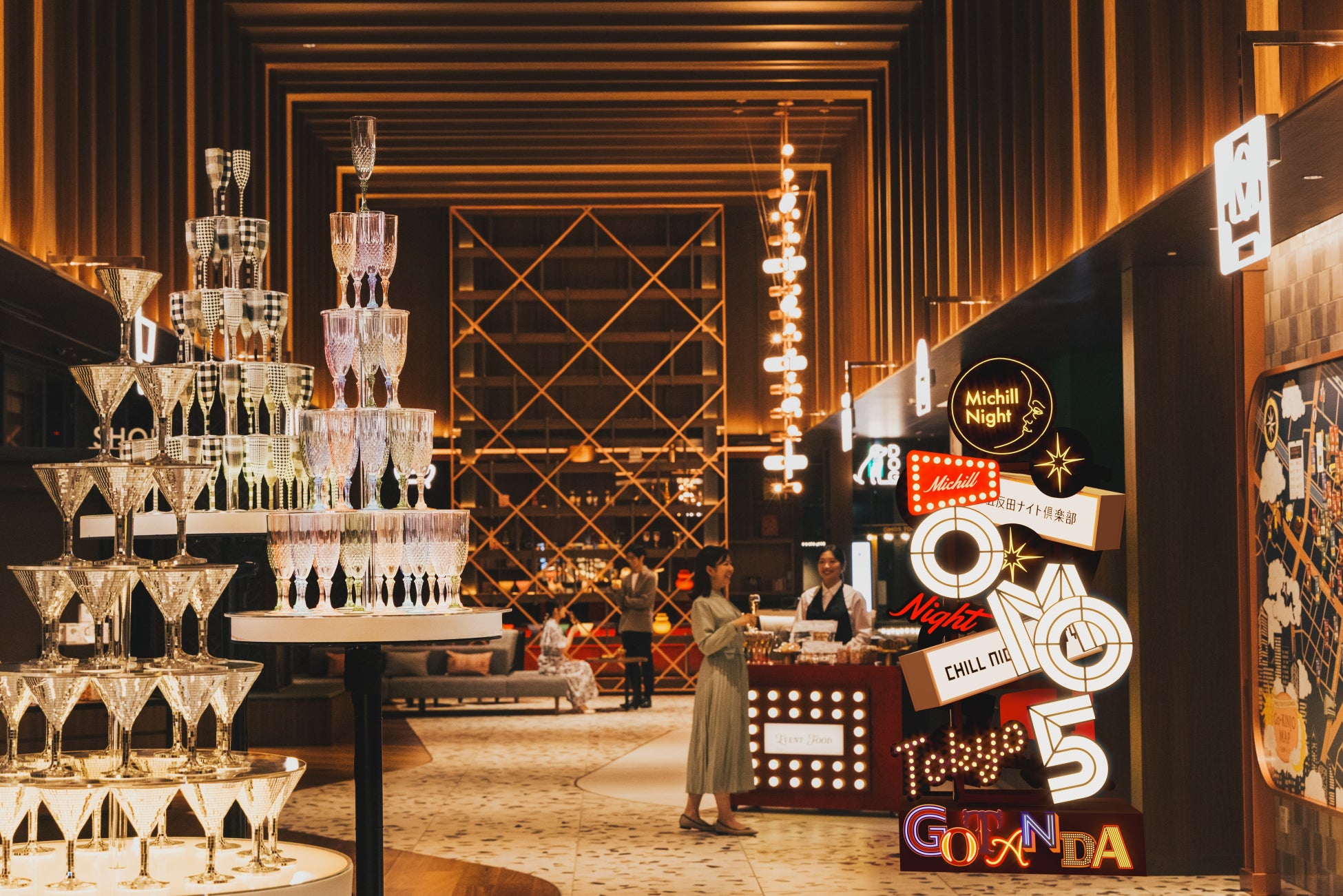 グルメの名店が並ぶ五反田の賑やかな夜をOMOベースに演出。ネオンやシャンパンタワーなどの装飾が華やかに彩ります。五反田の人気店とコラボしたスイーツやおつまみ、ドリンクを思い思いに味わえば、一日の終わりが最高の気分に。