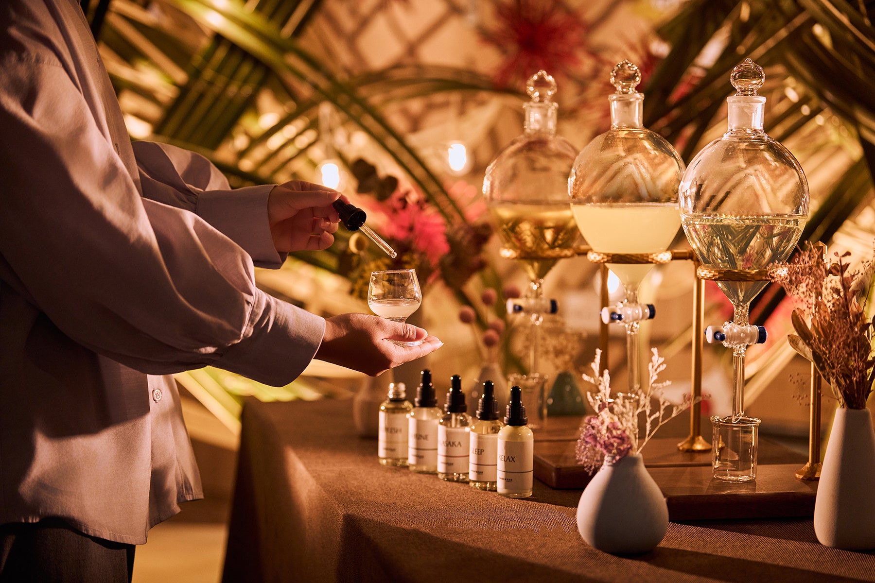 日本三大華道のひとつ「草月流」によるダイナミックないけばなが彩る空間で、気分に合わせた香りを創る調香体験を提供。赤坂の老舗茶舗「土橋園」のハーブをブレンドした煎茶や、華やかな香りに包まれるバスソルトで、心安らぐ夜を演出します。