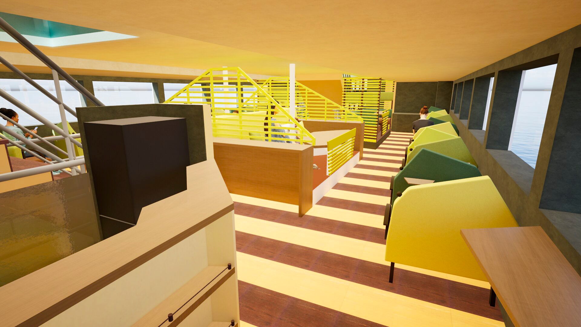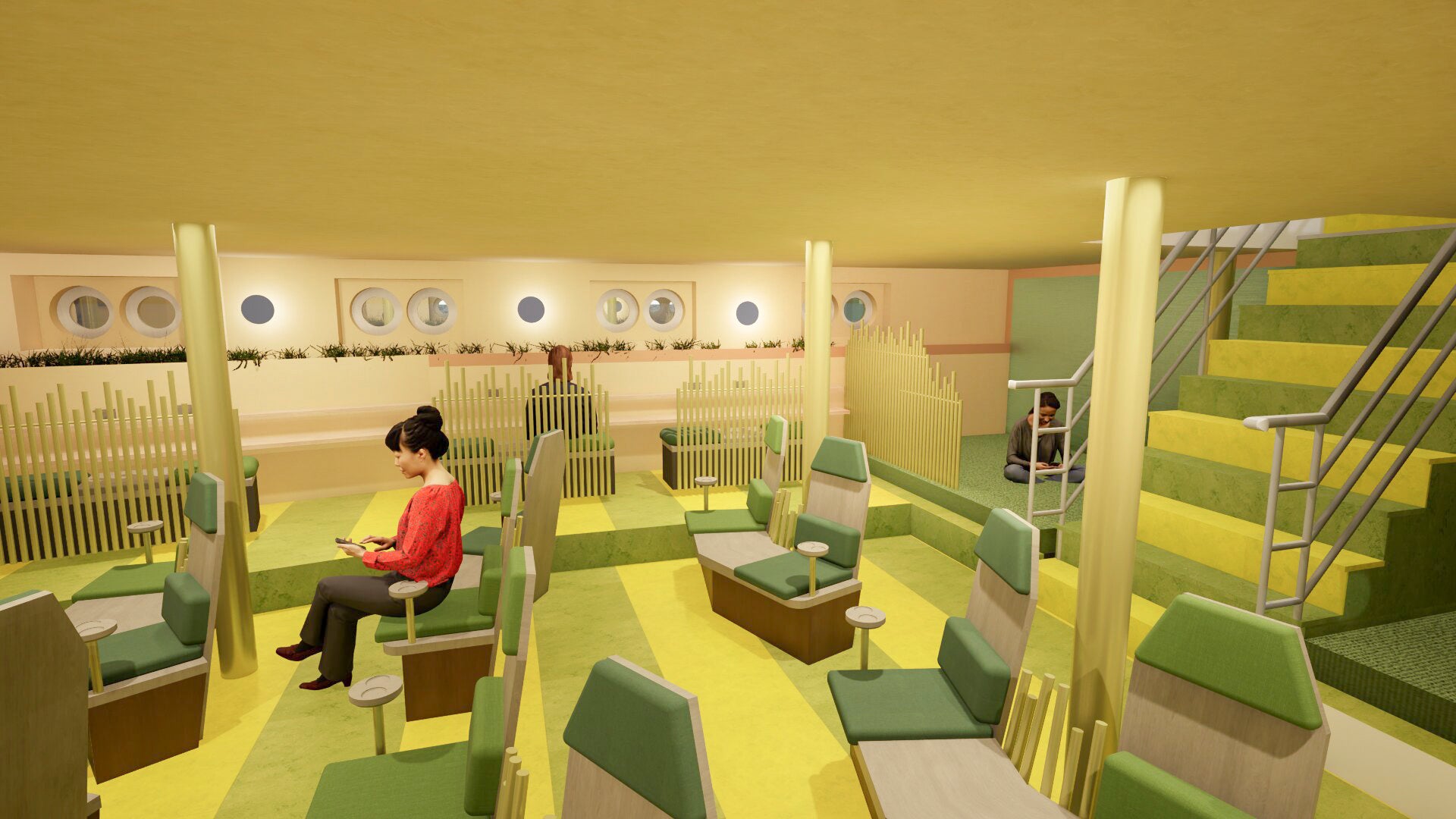 全4階(地階~3階)からなる船内で、最も特別なのが1階前方に位置する「特別室:金富士」です。ソファを備えたプライベート客室からは、大きな窓越しに大海原を一望でき、初島から熱海港への航海中には富士山を見ることもできます。2階の遊歩デッキは竹馬風ベンチがある公園のような空間で、お子さまの目線に合わせて設計された大きな窓からダイナミックな海の景色をお楽しみいただけます。そのほか人工芝の広場や富士山型の背もたれを備えたボックスシートで波しぶきを間近に感じたり、半個室風スペースでご家族とゆったりとお過ごしいただくこともできます。全てのフロアを巡りながら、遊び心満載のワクワク感をご体感いただける新船ですので、シーンに合わせて思い思いのお時間をお楽しみください。