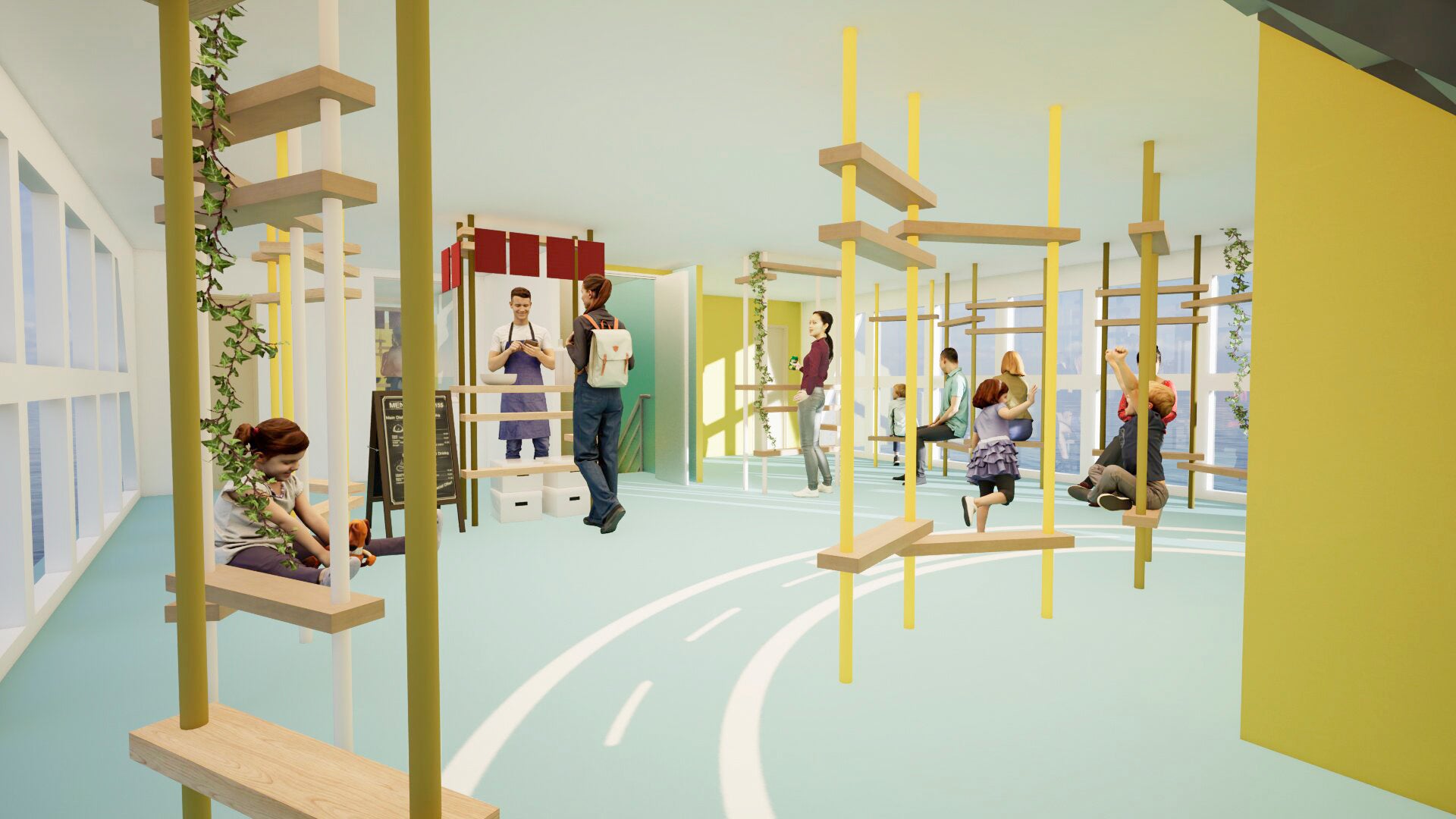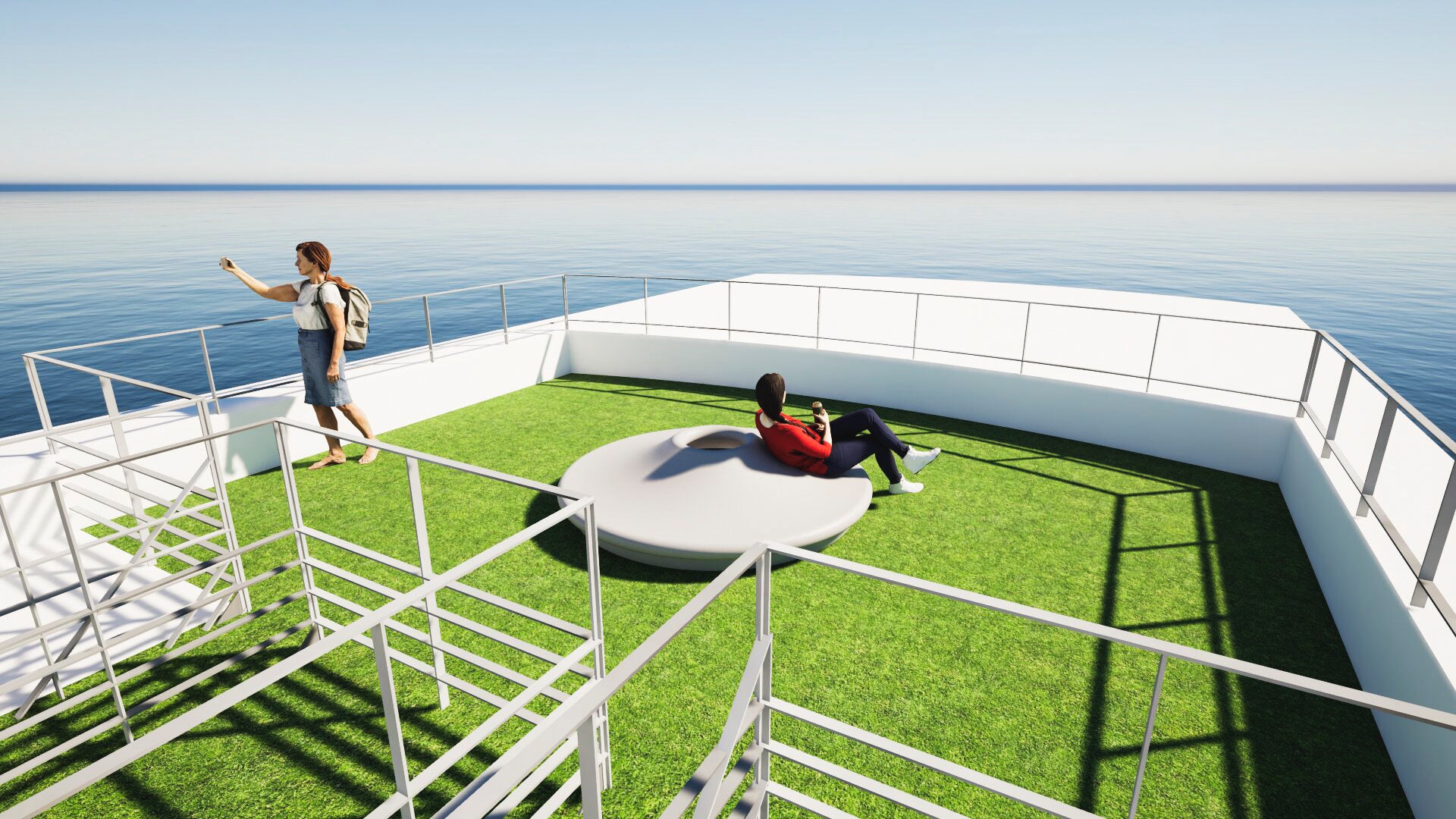 2階遊歩デッキと3階デッキは、初島に通じる自然やアソビを詰め込んだワクワクするエリアです。2階の遊歩デッキは、竹馬風ベンチのほか床面にレールアートが施された公園のような空間です。また、お子さまの目線に合わせて設計された大きな窓からダイナミックな海の景色をお楽しみいただけます。3階デッキは人工芝生の広場が広がります。