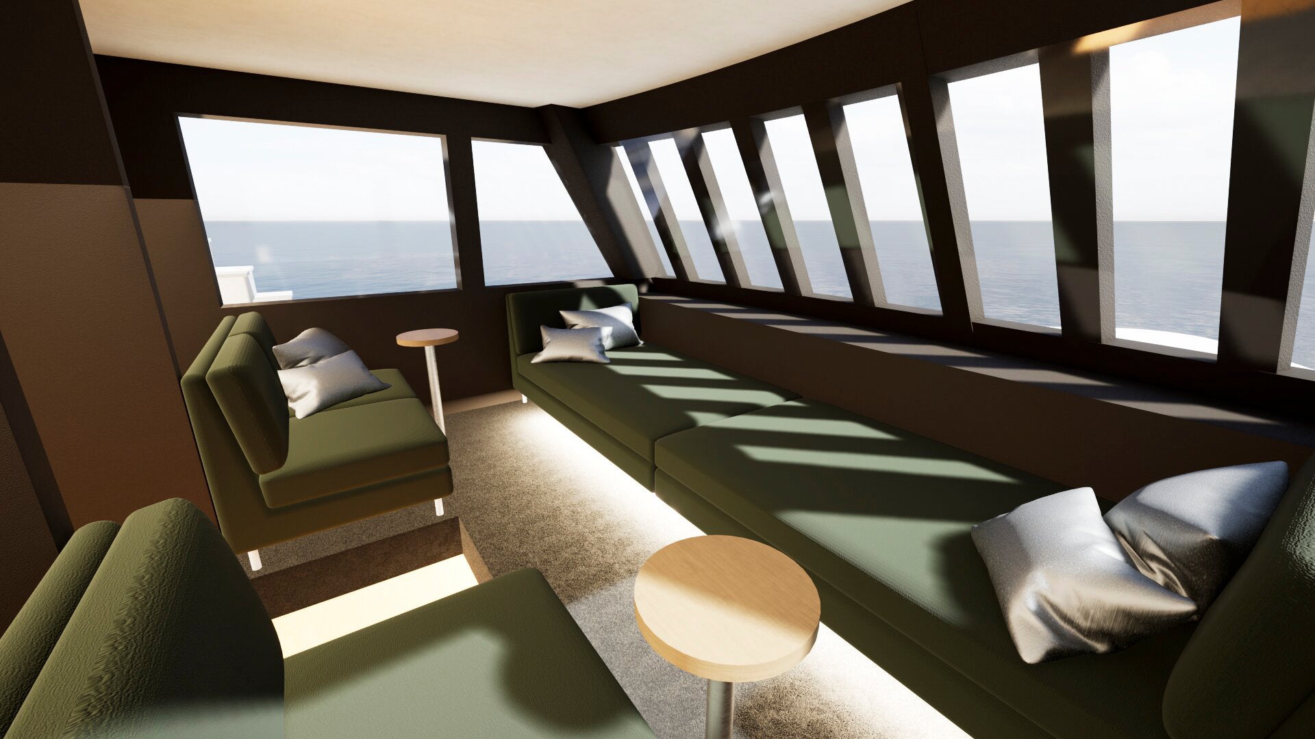 ソファを備えたプライベート客室からは、大きな窓越しに大海原を一望でき、初島から熱海港への航海中には富士山を見ることもできます。貸切で最大8名まで利用できます。