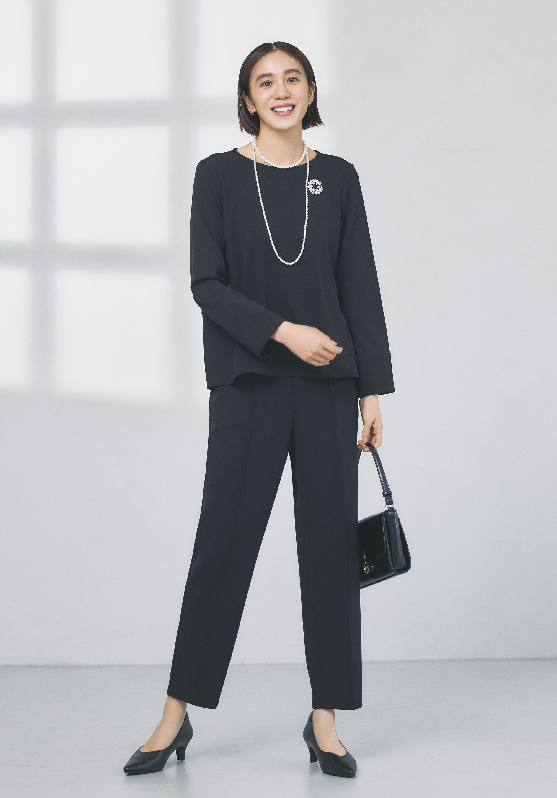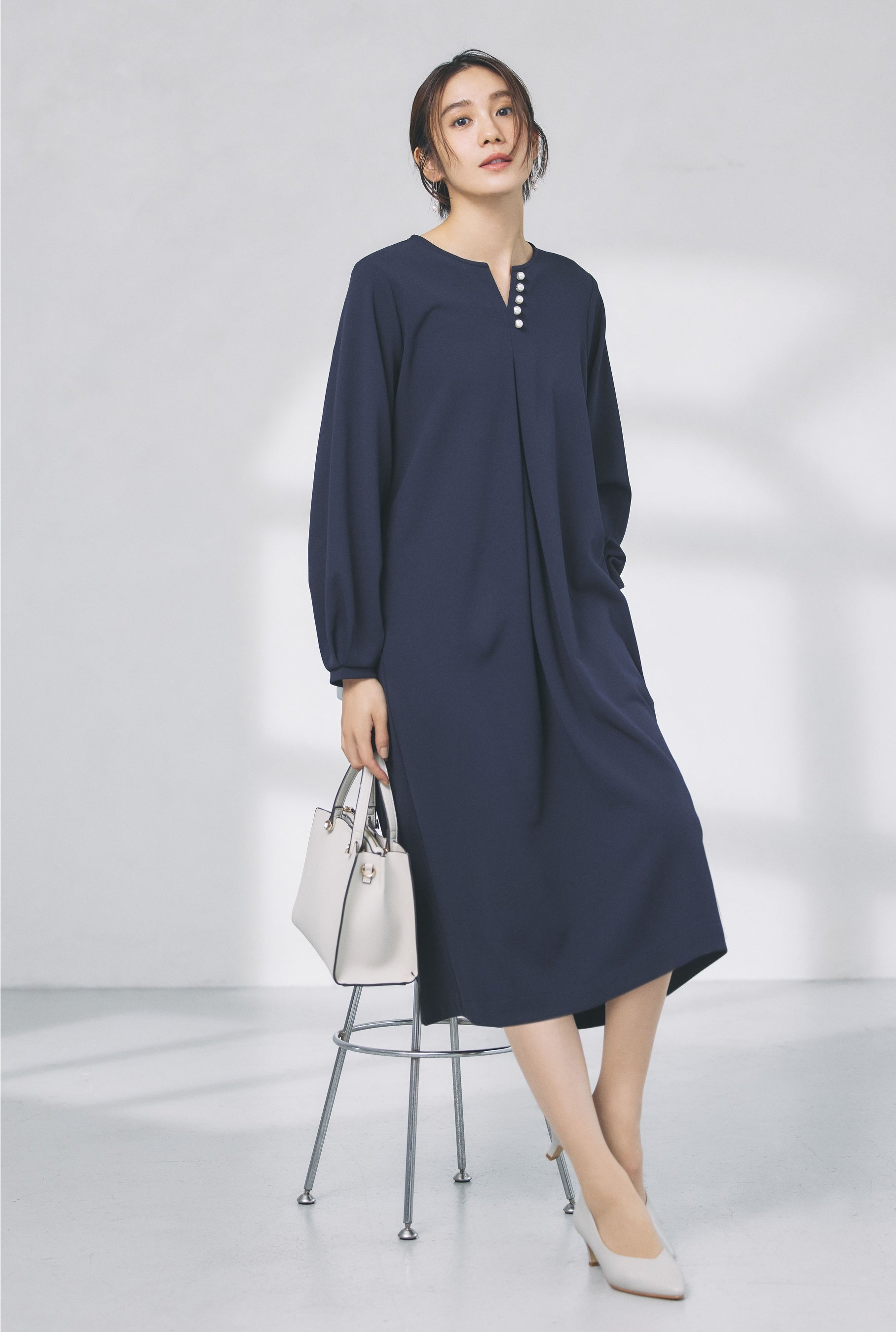 楽な着心地で着映える" ラク映えシリーズ "。テーパードシルエットですっきり着こなせるセットアップと胸元のパールが華やかさを演出するワンピースの2種類でご用意。手洗い可能でシワになりにくい特性もポイント。