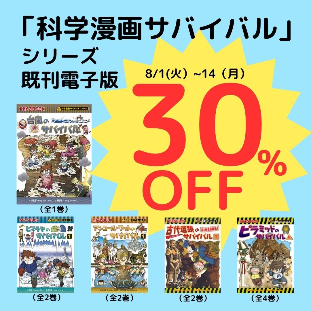 累計で1350万部を突破し、日本発売15周年を迎えた「科学漫画サバイバル」シリーズは、7月に初の改訂版として『昆虫世界のサバイバル』(全3巻)を発売いたしました。国立科学博物館名誉研究員で理学博士の小野展嗣氏を監修者に迎え、最新の科学情報を反映しています。人気のテーマで、初めてサバイバルを読むお子さまにもおすすめの『昆虫世界のサバイバル』の改訂を機に、シリーズにますます親しんでいただけるよう、期間限定でお得なセールを開催。新たに電子版が発売となった11冊を8月1日から8月14日までの間、以下の書店にて、30%オフで発売いたします。