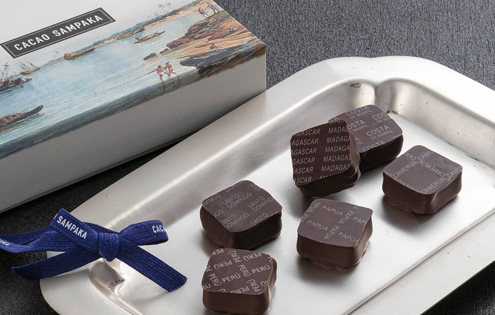 6カ国のカカオ原産地別ボンボンチョコレート。ひと粒ごとの特徴を紹介したテイスティングリーフレット付き。ペルーは大丸松坂屋限定。