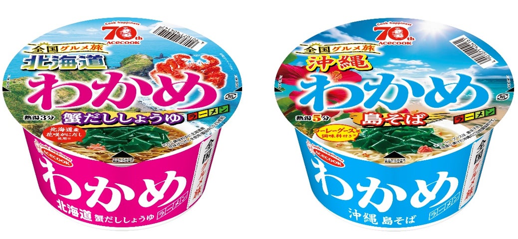 エースコック株式会社(本社:大阪府吹田市 社長:村岡寛)は、2024年4月22日より、「全国グルメ旅×わかめラーメン 北海道 蟹だししょうゆ/沖縄 島そば」を新発売します。