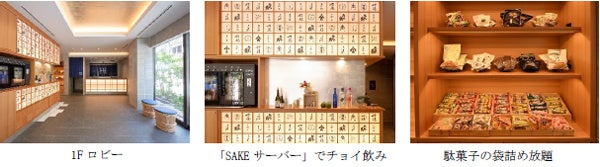 1階のロビーフロアの一角にある「IZAKAYA」では、SAKEサーバーによるチョイ飲みや駄菓子の詰め放題が体験できます(※1)。角打ちのようなオープン空間なので、日本文化や懐かしさを感じながら、ゲスト同士やフロントスタッフと、旅先ならではの会話が弾むこともあるかもしれません。