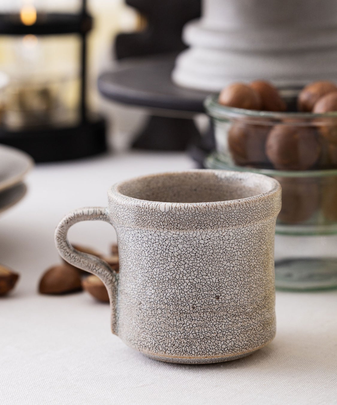「hibi(ヒビ)」の梅花皮(かいらぎ)の技法も注目です。形を作った土の上に泥状の白い土を塗り、乾燥させた後に素焼きを行う際、土の収縮率の違いからヒビが入るのが特徴。その縮れのヒビをテクスチャーのひとつとして巧みに活用しています。この日本独自のユニークな技法が、fractalシリーズの魅力を引き立てています。