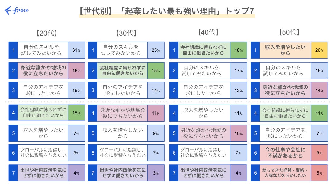 年代別に起業したい理由を見ると、30代・40代では上位に「会社組織に縛られず自由に働きたいから」が入り、現在所属している組織内で感じていることが反映されていました。