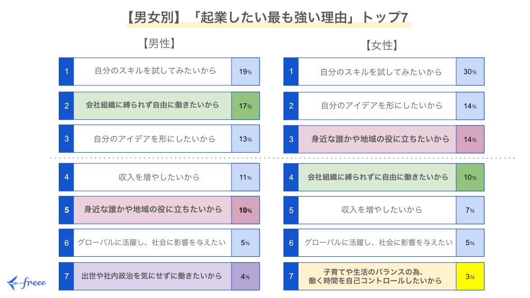 また、女性では7位に「子育てや生活のバランスのため、働く時間を自己コントロールしたいから」という理由が入り、ワークライフバランスのために起業を考える層が一定数いることもわかりました。