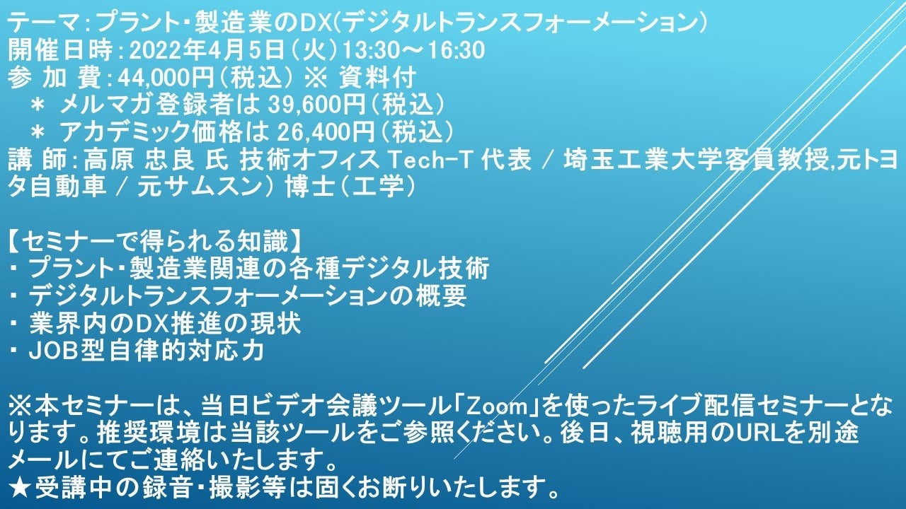先端技術情報や市場情報を提供している(株)シーエムシー・リサーチ(千代田区神田錦町: https://cmcre.com/ )では、 各種材料・化学品などの市場動向・技術動向のセミナーや書籍発行を行っておりますが、 このたび「プラント・製造業のDX(デジタルトランスフォーメーション)」と題するセミナーを、 講師に高原 忠良 氏 技術オフィス Tech-T 代表 / 埼玉工業大学客員教授,元トヨタ自動車 / 元サムスン) 博士(工学))をお迎えし、2022年4月5日(火)13:30より、 ZOOMを利用したライブ配信で開催いたします。 受講料は、 一般:44,000円(税込)、 弊社メルマガ会員:39,600円(税込)、 アカデミック価格は26,400円(税込)となっております(資料付)。