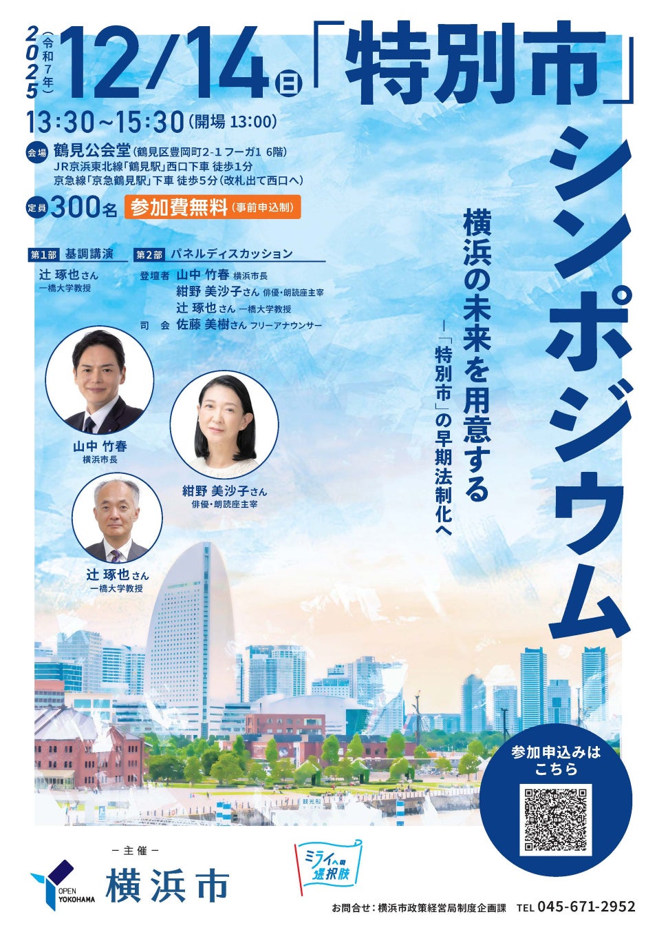 シンポジウムの第1部では、一橋大学教授の辻琢也さんにご講演いただき、「特別市」について分かりやすくお伝えします。第2部では、横浜市在住の俳優の紺野美沙子さんをゲストに迎え、辻琢也さん、山中竹春横浜市長の3人が登壇し、「特別市」をテーマに横浜の未来について語り合います。