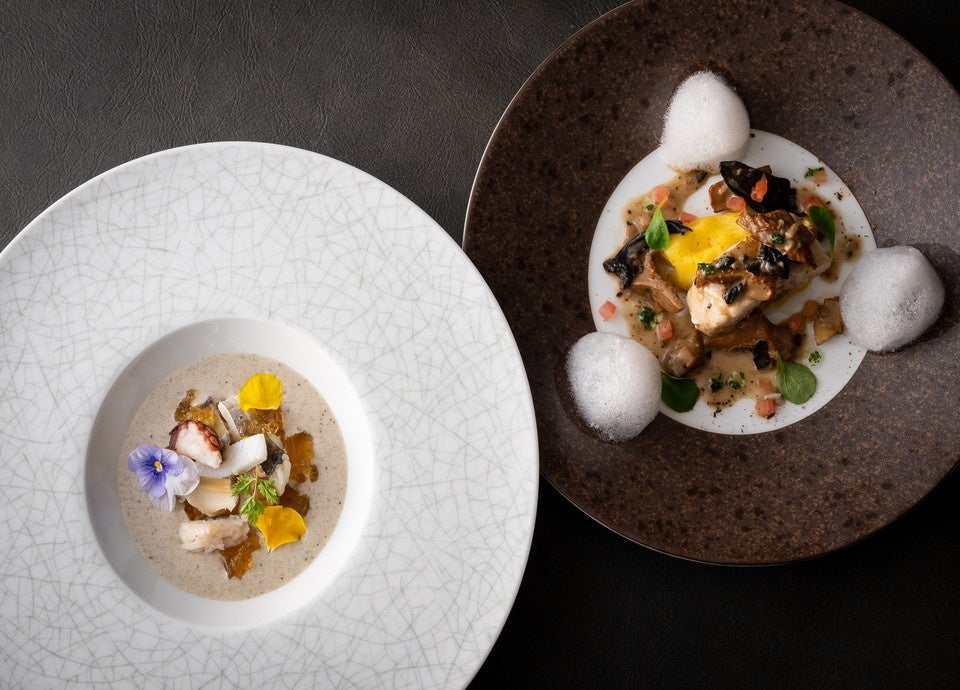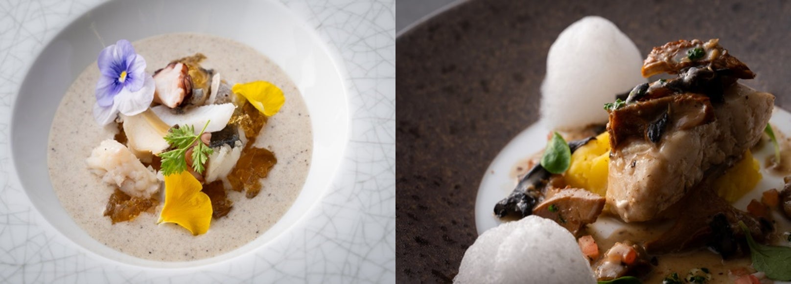 店舗コンセプトになぞらえたイベント専用のディナーコースには、九州が誇る様々な食材にフレンチの技法を加えた、シェフこだわりのメニューをお届けいたします。最初にご用意する前菜には、大分県・熊本県・鹿児島県の食材をアレンジした贅沢な3品。大分県の魚として名高い関サバや関アジ同様のブランド魚・大分県産関イサキを鮎魚醤でマリネし、魚本来の味わいに濃厚な旨味をプラスした一品 “大分県産鮎魚醤でマリネした大分県産関イサキと大分県産かぼすのヴィネグレットとキャビア”。さらに、“ラングスティーヌ、熊本県産天草大王のバロティーヌ 柑橘のアクセント”では、熊本県の地鶏・天草大王の持つ絶妙な歯ごたえと弾力、ジューシーさを活かしたまま、濃厚な旨みを持つラングスティーヌとともに優しく火入れをすることで、それぞれの美味しさを引き立たせた一品です。その他にも、福岡県を代表する関門蛸に北九州あわび、豊前の鱧を揃えた一皿。魚種の豊富さ全国1位といわれている長崎県産天然魚を使用した魚料理に、佐賀牛フィレを使用したメイン。芳醇で強い香りと、とろけるような甘さが魅力の宮崎県産アップルマンゴーを使用したデザートなど、魅力あふれるラインナップを揃えます。
