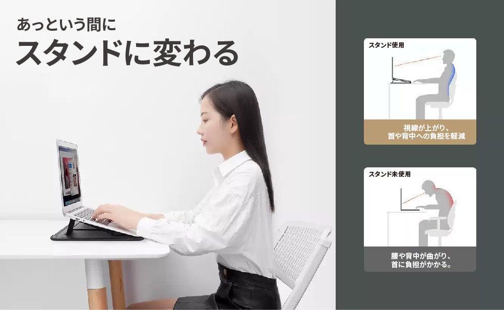 ラップトップスタンドを使用することで首や背中への負担を無くし、より快適にご利用いただけます。