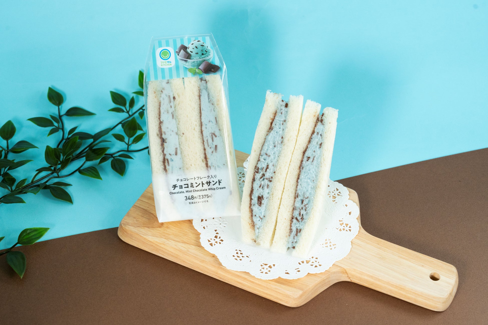 【内容】国産ミントの爽やかな味わいが美味しいミントホイップとチョコレートソースを合わせたサンドイッチです。ホイップに隠れたチョコフレークの食感がアクセントになっています。