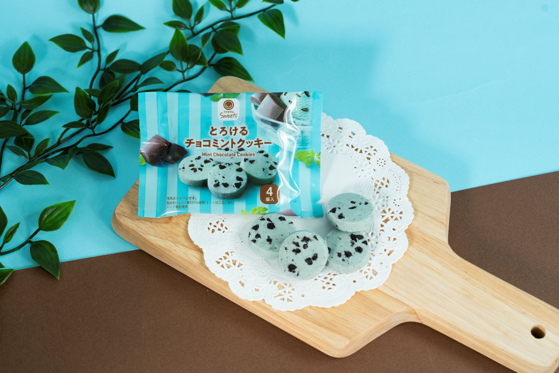 【内容】くちどけなめらかなミント味のクッキーにココアビスケットを加えた、ひとくちサイズのクッキーです。爽快感のあるミントの風味が楽しめます。