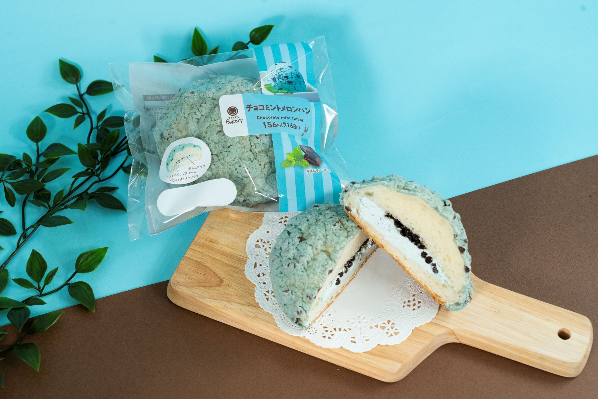 【内容】チョコチップ入りのミントビスケット生地をかぶせて焼き上げたメロンパンに、ミントホイップクリームとチョコチップをサンドしました。どこから食べてもチョコミントを味わえます。