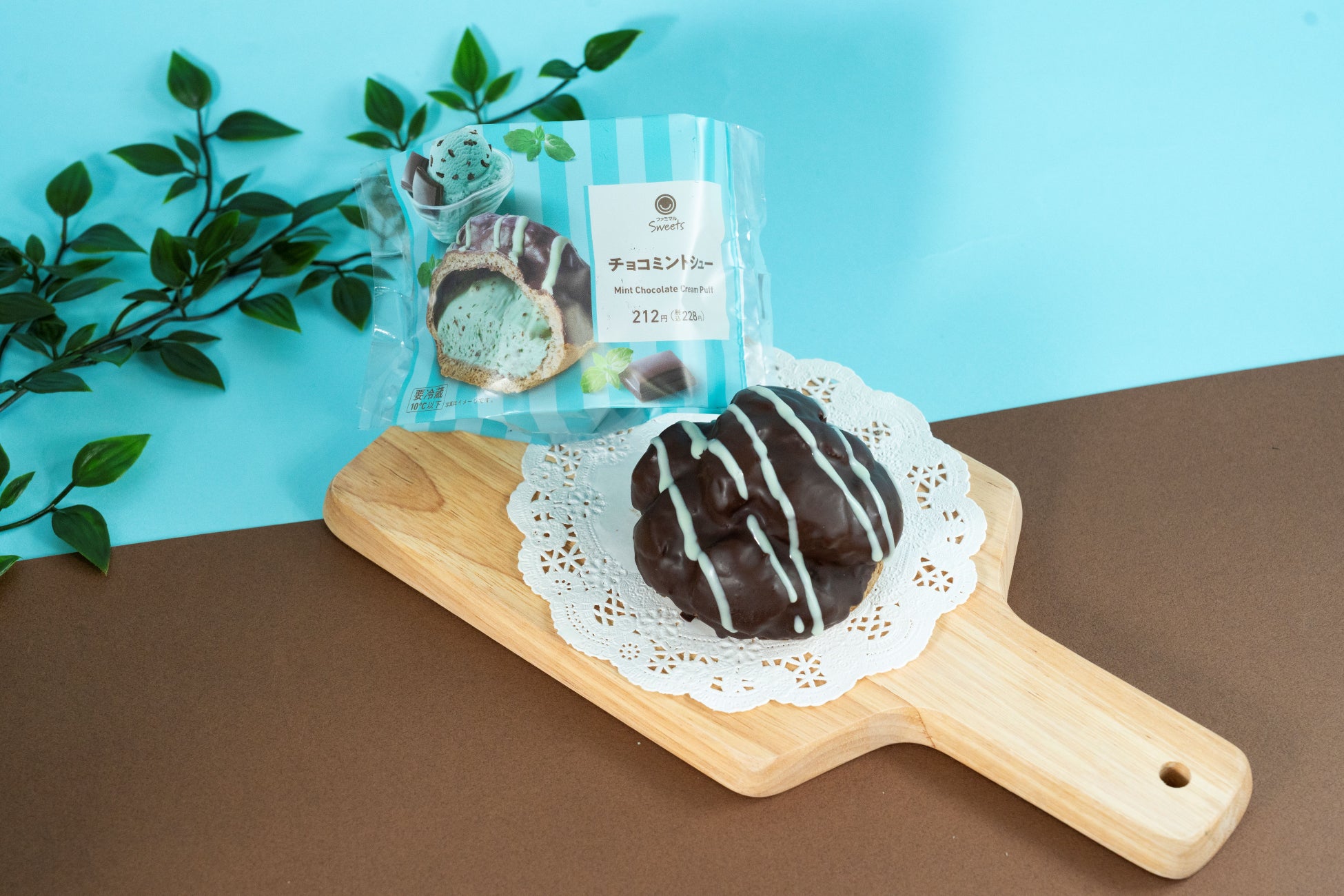 【内容】チョココーティングしたシュー生地の中に、チョコフレーク入りのチョコミントクリームを入れたシュークリームです。