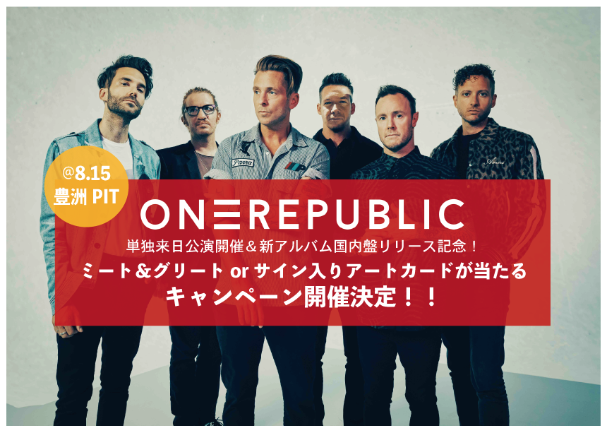 今作のリリースと単独来日公演の開催を記念して、抽選でワンリパブリックに直接会えるミート&グリートまたはサイン入りアートカードが当たるキャンペーンを実施します。ミート&グリートは日本単独公演『SUMMER SONIC EXTRA』の当日に会場で開催、単独来日公演チケット購入者かつ、今作の国内盤CDを購入またはデジタルアルバム(デラックスver)をダウンロード、キャンペーンへ応募した中から抽選で限定10名様に、サイン入りアートカードは抽選で20名様に当たります。