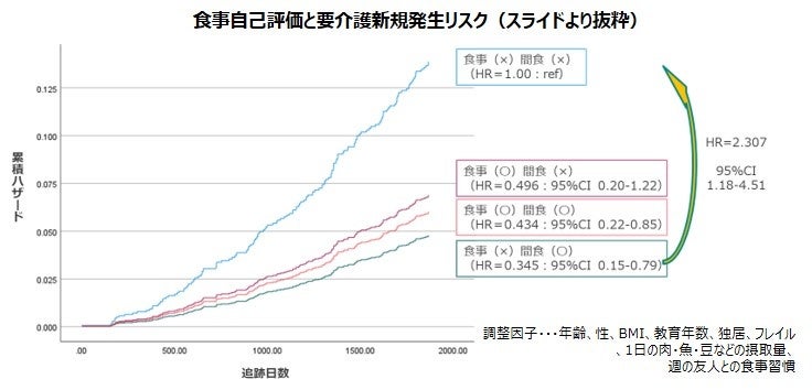 このことから、同じような食事バランスの場合、地域在住の高齢者において間食習慣が介護予防の観点から重要である可能性が示唆されました。