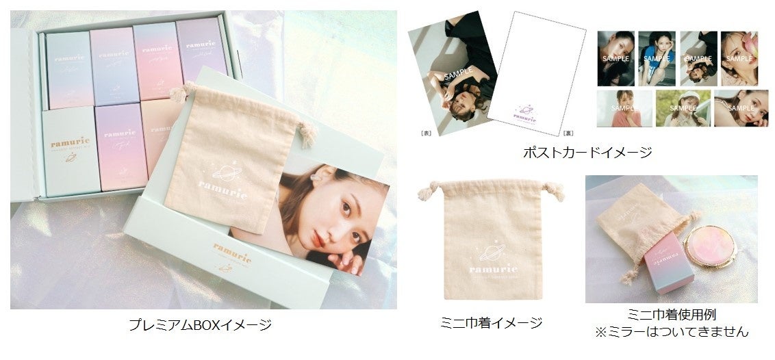 さらに、フリューのカラコンEC サイト『Mew contact』では、本日7月14日(木)より300個限定のプレミアムBOXを発売。本商品全7カラー各1箱に加え、佐藤ノアさんの厳選した写真を使用したオリジナルポストカード1枚、『ramurie』のロゴ入りミニ巾着1個がセットになっています。また、一部カラコンEC サイトにて『ramurie』購入時にご利用いただける割引クーポンを期間限定で配布します。