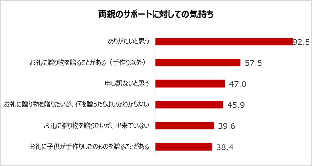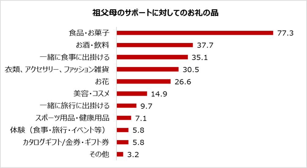 ●祖父母が、お金や時間をかけて孫の世話をサポートしてくれることに対して、9割以上(92.5%)が「ありがたいと思う」と回答(図4)。両親へ感謝の気持ちを伝えるための贈り物については、1位「食品・お菓子」(77.3%)、「お酒・飲料」(37.7%)、「衣類、アクセサリー、ファッション雑貨」(30.5%)などが上位にランクイン(図5)。