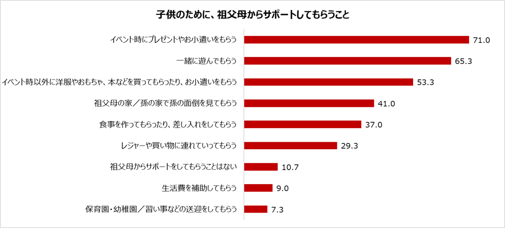 ●普段子供のために祖父母から受けているサポートについては、「イベント時にプレゼントやお小遣いをもらう」(71.0%)が1位、次いで「一緒に遊んでもらう」(65.3%) 、「イベント時以外に洋服やおもちゃ、本などを買ってもらったり、お小遣いをもらう」(53.3%)(図3)。