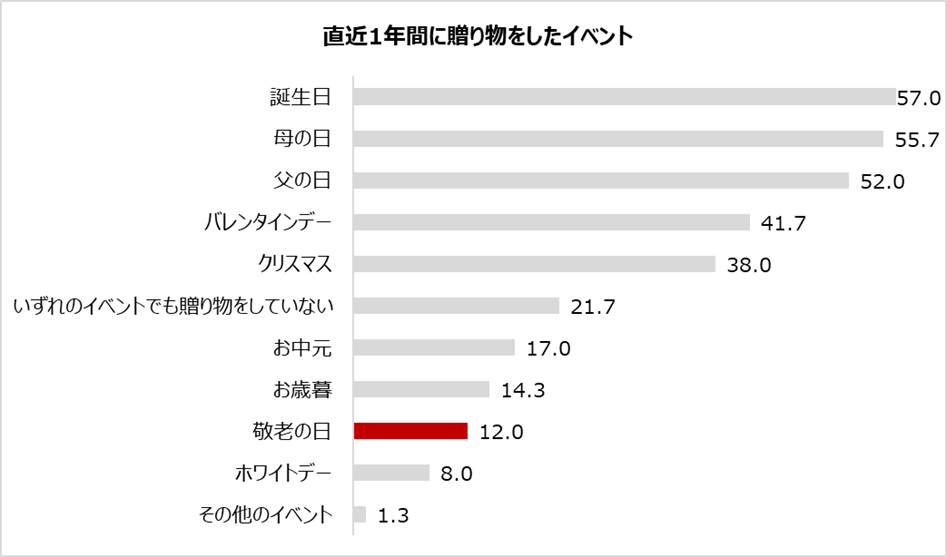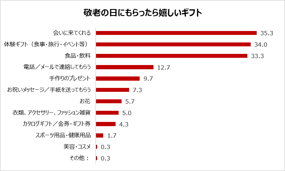 「敬老の日に関する調査」(注3)では、3歳未満の孫がいる祖父母がもらったら嬉しいギフトは、1位「会いにきてくれる」(35.3%)、2位「体験ギフト(食事・旅行・イベント等)」(34.0%)、3位「食品・飲料」(33.3%)という結果になりました。詳細は、以下をご確認ください。