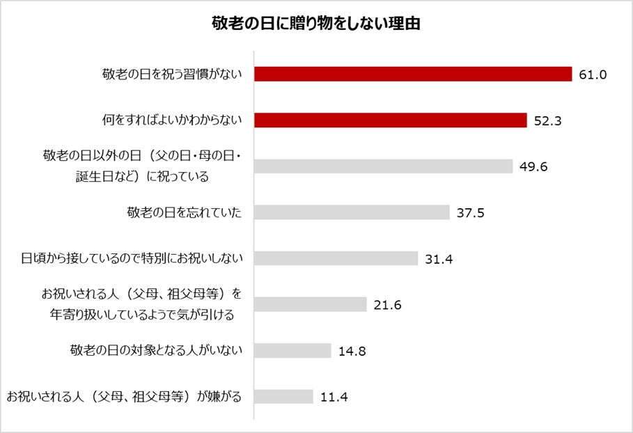 ●敬老の日に祖父母へギフトを贈っていると回答したのは、3歳以下の子供がいる親の約1割(12.0%)(図1)。また、「敬老の日にギフトを贈っていない」人のうち約6割が「敬老の日を祝う習慣がない」(61.0%)、約半数が「何をすればいいのかわからない」(52.3%)と回答(図2)。