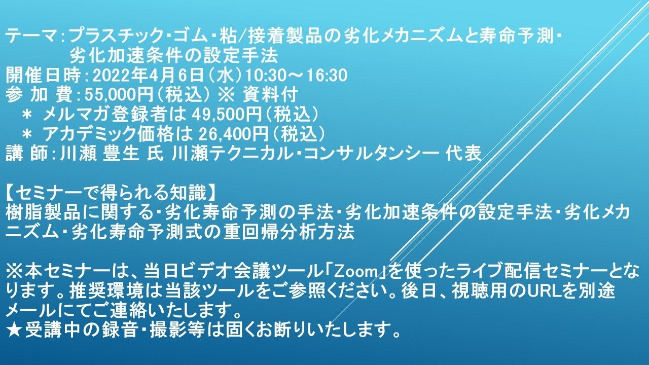 先端技術情報や市場情報を提供している(株)シーエムシー・リサーチ(千代田区神田錦町: https://cmcre.com/ )では、 各種材料・化学品などの市場動向・技術動向のセミナーや書籍発行を行っておりますが、 このたび「プラスチック・ゴム・粘/接着製品の劣化メカニズムと寿命予測・劣化加速条件の設定手法」と題するセミナーを、 講師に川瀬 豊生 氏 川瀬テクニカル・コンサルタンシー 代表)をお迎えし、2022年4月6日(水)10:30より、 ZOOMを利用したライブ配信で開催いたします。 受講料は、 一般:55,000円(税込)、 弊社メルマガ会員:49,500円(税込)、 アカデミック価格は26,400円(税込)となっております(資料付)。