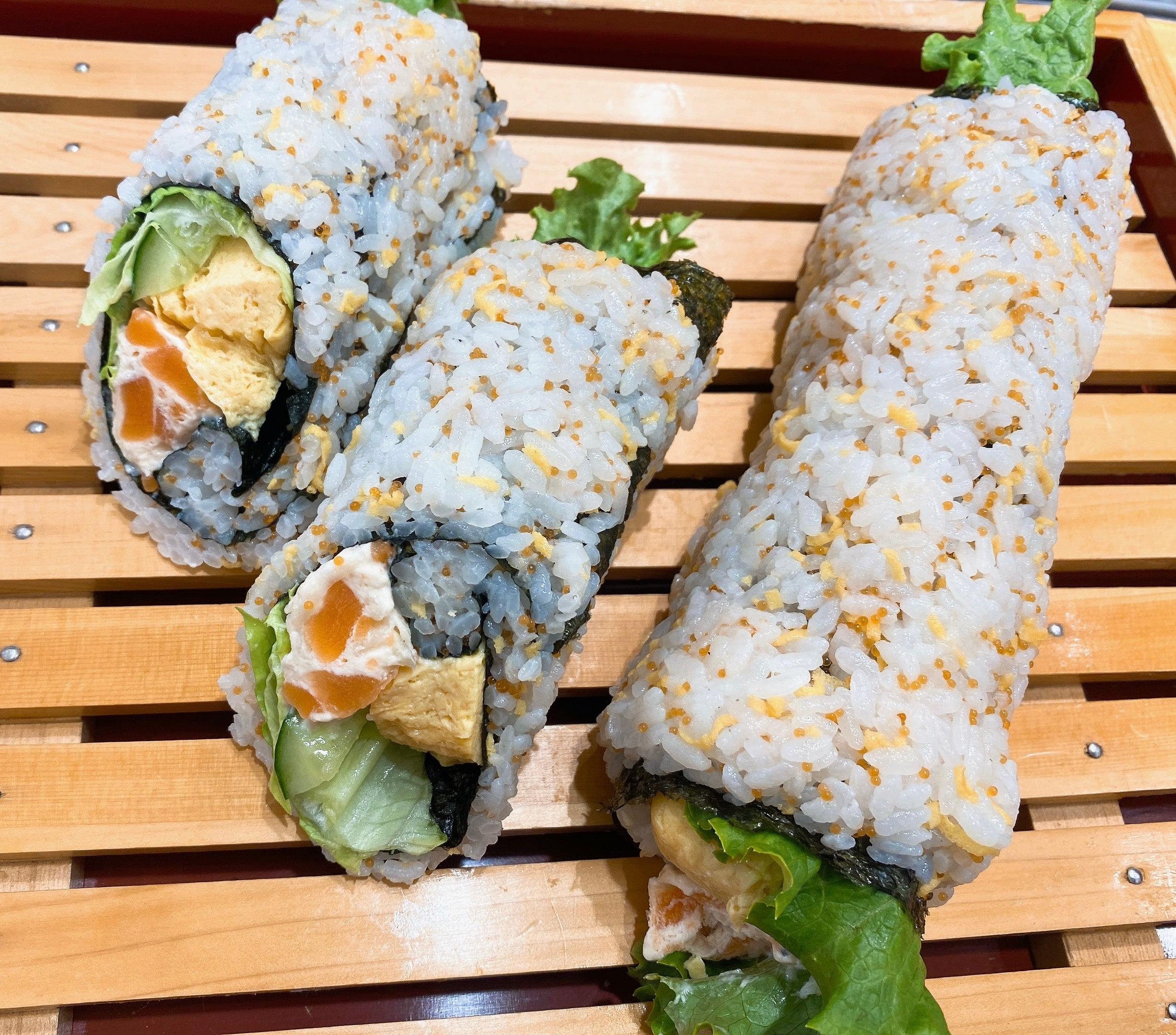 サーモン、とびっこ、たまご、クリームチーズ、サニーレタス、錦糸、キュウリなどを裏巻きで巻きました。