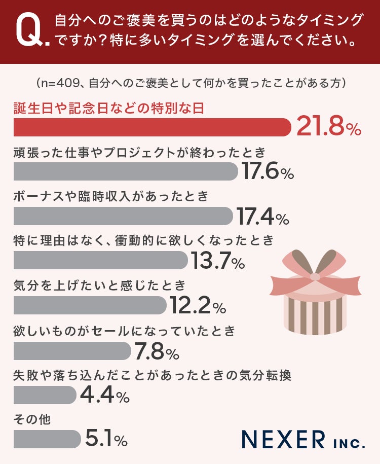 続いて、自分へのご褒美を買うのはどのようなタイミングが多いか聞いてみました。