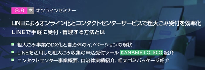 本セミナーでは、ご家庭における粗大ごみ収集申込みの手続きに、LINEを活用することで自動化と効率化を実現したツール「KANAMETO ECO」の特徴やメリットをご紹介しながら、その導入方法や活用事例を具体的に解説します。