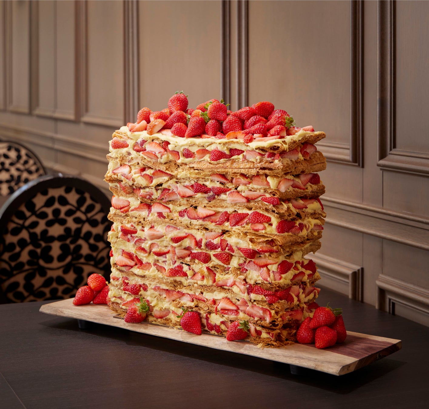 神戸・北野の異人館の街に佇む「五感で感じるフレンチ」や「世界一の朝食」を出す神戸北野ホテル。ミル・ミルフィーユは、スイーツビュッフェの目玉のひとつで、大きさは縦約35㎝×横40㎝×奥行約15㎝(60名用)。サクサクのパイになめらかなカスタードチョコレートクリーム、たっぷりのいちごをあしらった圧巻のミルフィーユです。