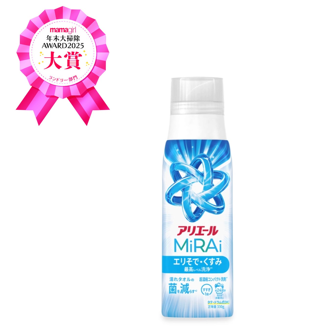 超濃縮コンパクト洗剤、「MiRAiアリエールMiRAi 超濃縮」が、洗濯洗剤の大賞に!香りで誤魔化さず、有効成分を高配合しているため、洗うだけで新品級の消臭が叶います。また成分を濃縮しており、1本あたりの洗濯回数も多く、買い替えの頻度が減ることも、ママたちの家事負担を救います。