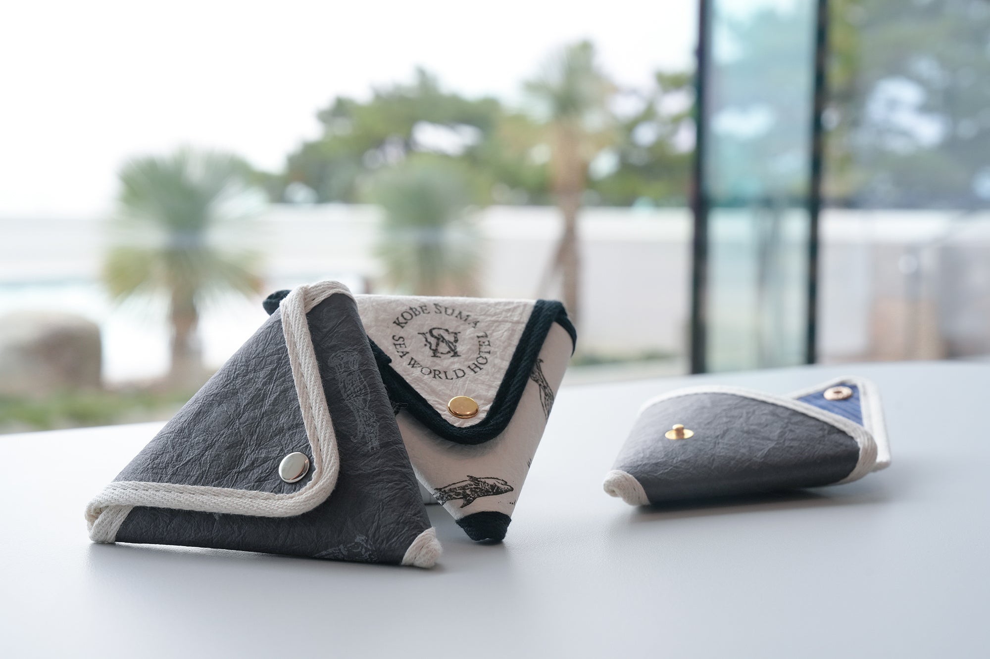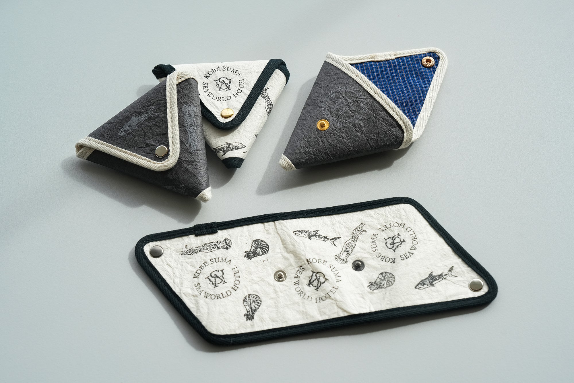 「兵庫の伝統が織りなす〜旅の想い出コインケース〜」では、せとうちハーバーレストランにてお飲み物を愉しみながら兵庫県多可町で受け継がれてきた技術と自然の恵みから生まれた雑貨ブランド「HALOP」についてお伺いした後、兵庫の伝統工芸「播州織」と和紙「杉原紙」を使用したシャチカラーのオリジナルコインケース作りを体験いただけます。ワークショップでは、表生地がシャチカラー(白と黒)の杉原紙、中生地が播州織のアイテムから好きな色合わせを選び、ロゴや海の生きもののスタンプを押して飾り付けて自分だけのオリジナルコインケースを制作することができます。神戸須磨シーワールドホテルの旅の思い出に、地域の伝統を使用した自分だけのアイテムをぜひお持ち帰りください。