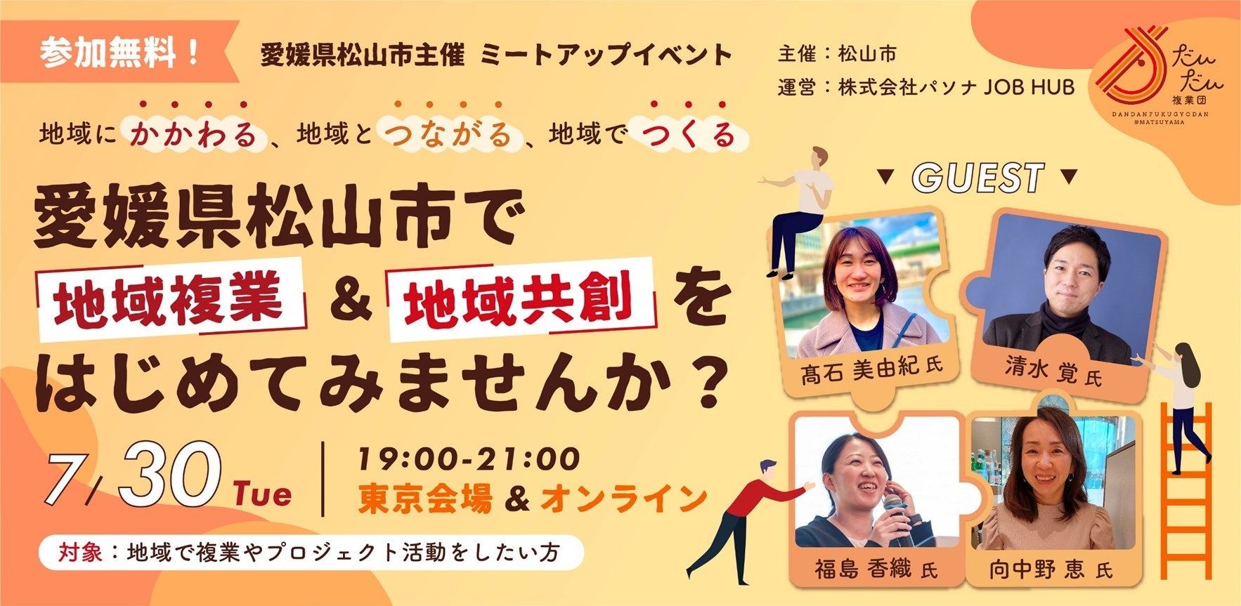 “愛媛県松山市内の中小企業”と“都市部人材”の継続的な関係構築を支援パソナJOB HUB『だんだん複業団』~地域複業に興味がある方を対象に「ミートアップイベント」を7月30日(火)開催~