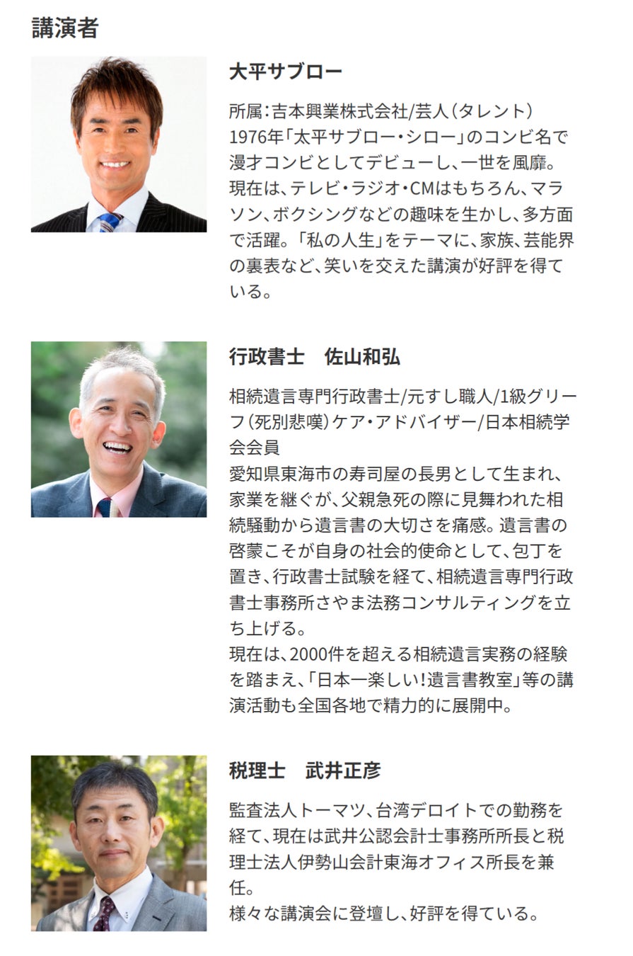 「お金の遺し方が分からない」「終活は何から始めれば良いのか」といった悩みを抱える人向けのイベント。お茶の間でおなじみの大平サブローさんと一緒に、気軽に楽しく基礎知識を学びます。