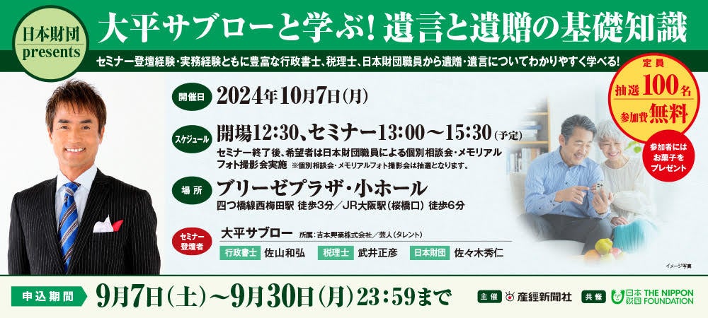 財産や遺言の残し方などを、お笑い芸人の大平サブローさんと一緒に楽しく学べるセミナー「大平サブローと学ぶ!遺言と遺贈の基礎知識」(産経新聞社主催、日本財団共催)を大阪・梅田のブリーゼプラザで10月7日(月)午後1時から開催し、参加者を募集します。