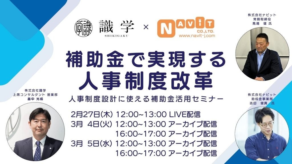 株式会社ナビットは、2025年2月27日(木)・3月4日(火)・3月5日(水)に株式会社識学主催セミナー「補助金で実現する 人事制度改革」に登壇いたします。
