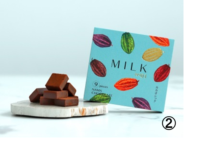 ②カカオの豊かな香りと、ミルクの甘みがバランス良い生チョコレート。ほどよい上品な甘さで、良質なミルクの風味が際立つ、シンプルでコク深い一粒です。