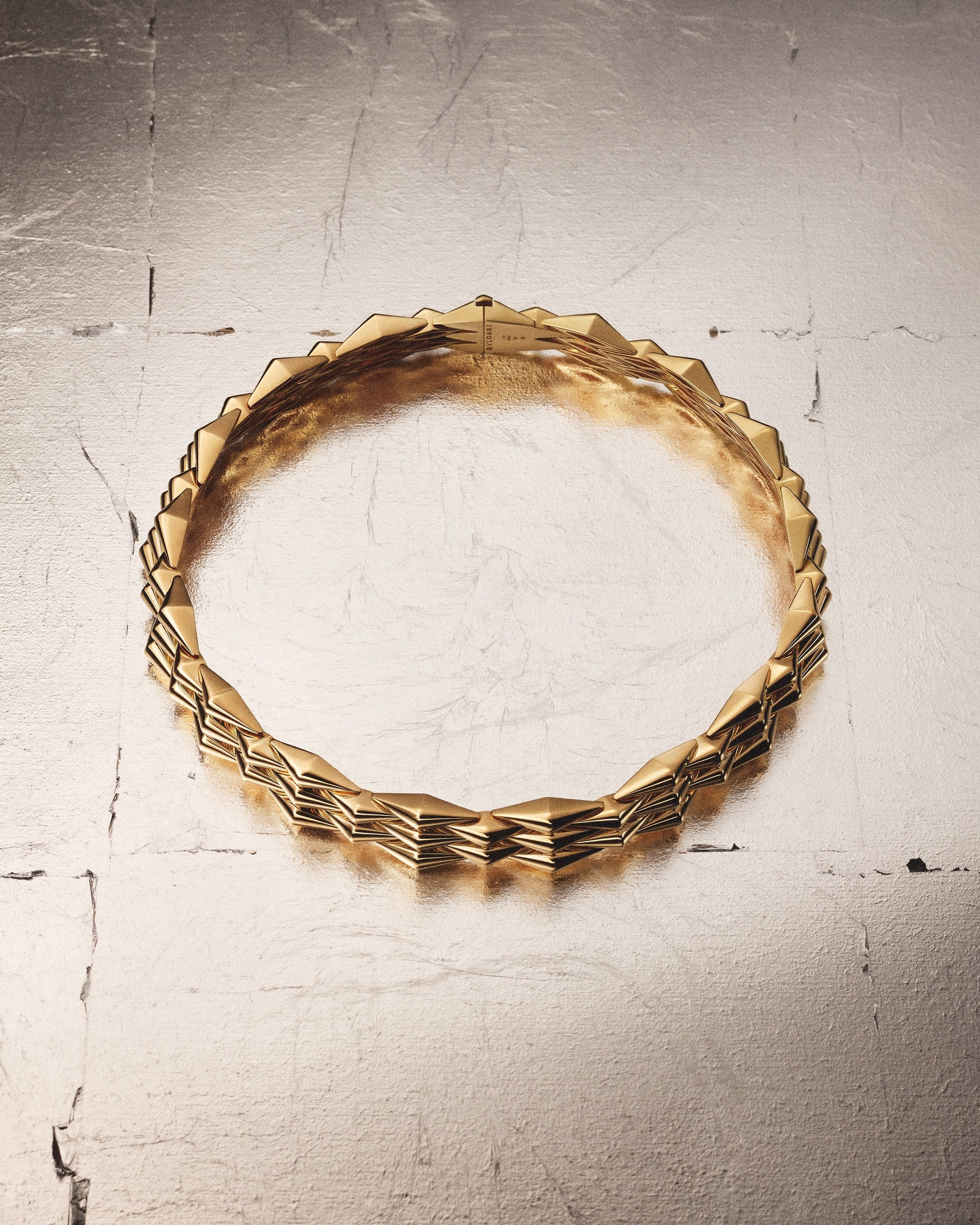 このコレクションの中心となるブレスレットは、アーカイブのジュエリーからインスピレーションを得ており、息をのむような職人技のレベルへと昇華されています。黄金の波が手首を包み込み、ひし形の要素が肌に完璧な調和をもたらします。それらは、目に見えない柔軟なリンクによって固定されています。時代を超越した魅力を帯びた現代的な大胆さは、ブルガリの本質そのものであるスタイルを再定義します。